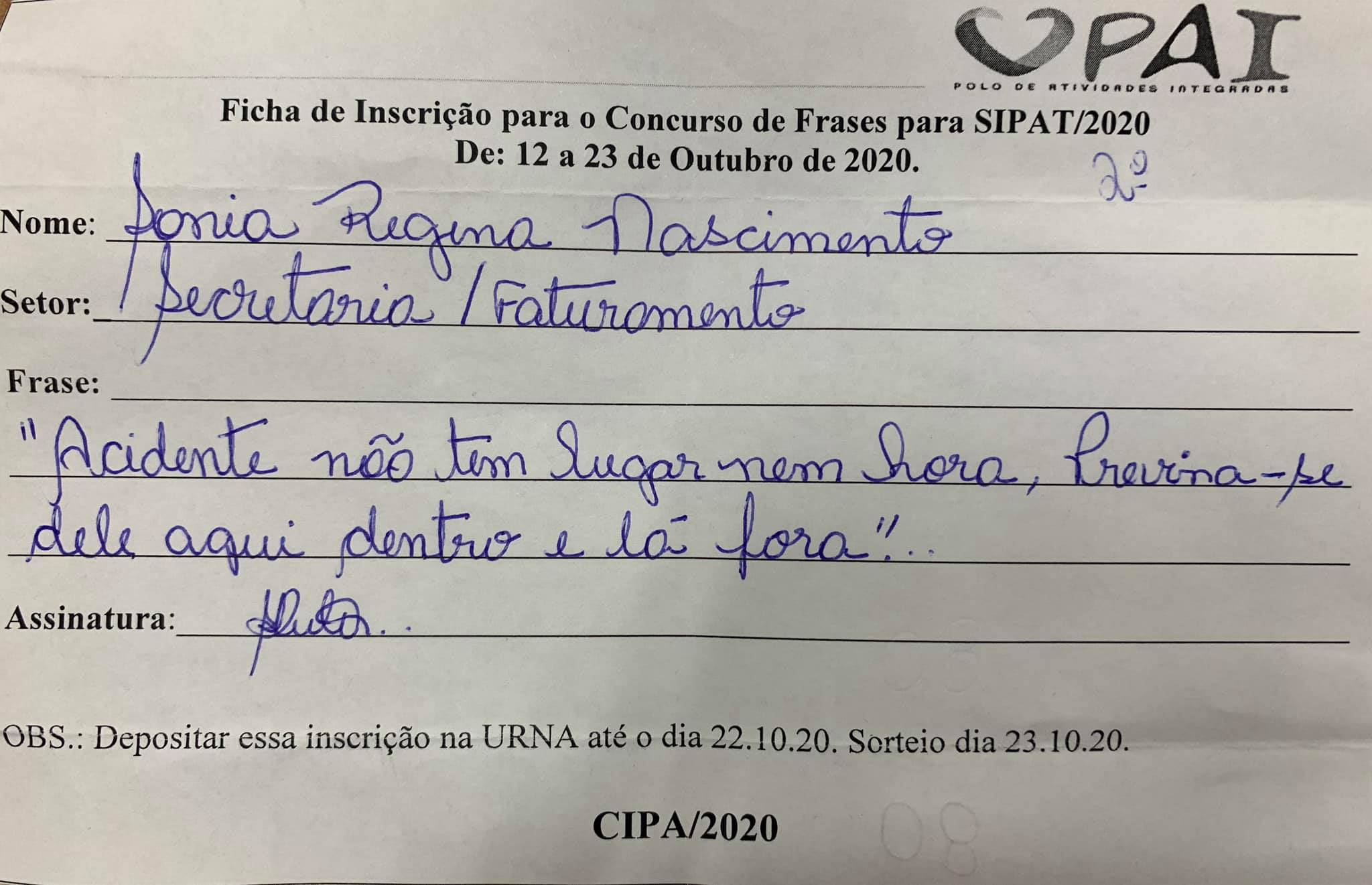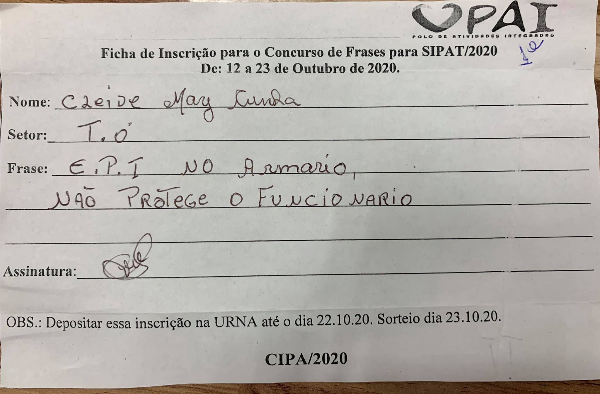 Hoje foi o dia do encerramento do Concurso de Frases SIPAT 2020. Foi escolhido dentre tantas, 3 frases, concorrendo a 3 prêmios sendo: 1º Lugar, Cleide Mary, 2º lugar, Sônia e em 3º Lugar, Renata.