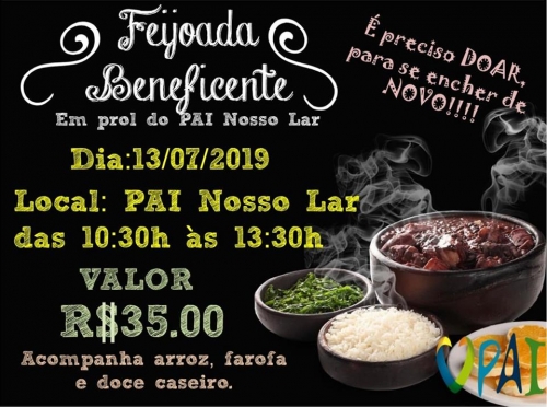 FEIJOADA BENEFICENTE CLÍNICA PAI NOSSO LAR. DIA 13.07.19. R$ 35,00. ENTREGA NA FRENTE DA CLÍNICA. A PARTIR DAS 10:30 HORAS ATÉ 13:30 HORAS. ACOMPANHAMENTOS TRADICIONAIS E SOBREMESA. DELICIOSAAAA. INFORMAÇÕES 3521.1984.