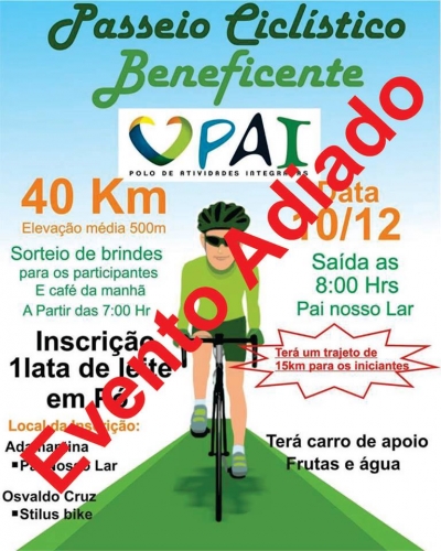 Escreveu Luaciana Lucianetti: Galera o pedal em prol ao Pai nosso lar que seria Domingo agora dia 10 foi adiado para dia 28/01 como a maioria sabe mês passado aconteceu um acidente com dois amigos do pedal . Então domingo agora será feito um pedal na cidade de Tupã onde o dinheiro da inscrição sera revertida para os dois acidentados e no dia 28/01 será então a nova data da pedalada do PAI nosso Lar. Obrigado pela compreensão.